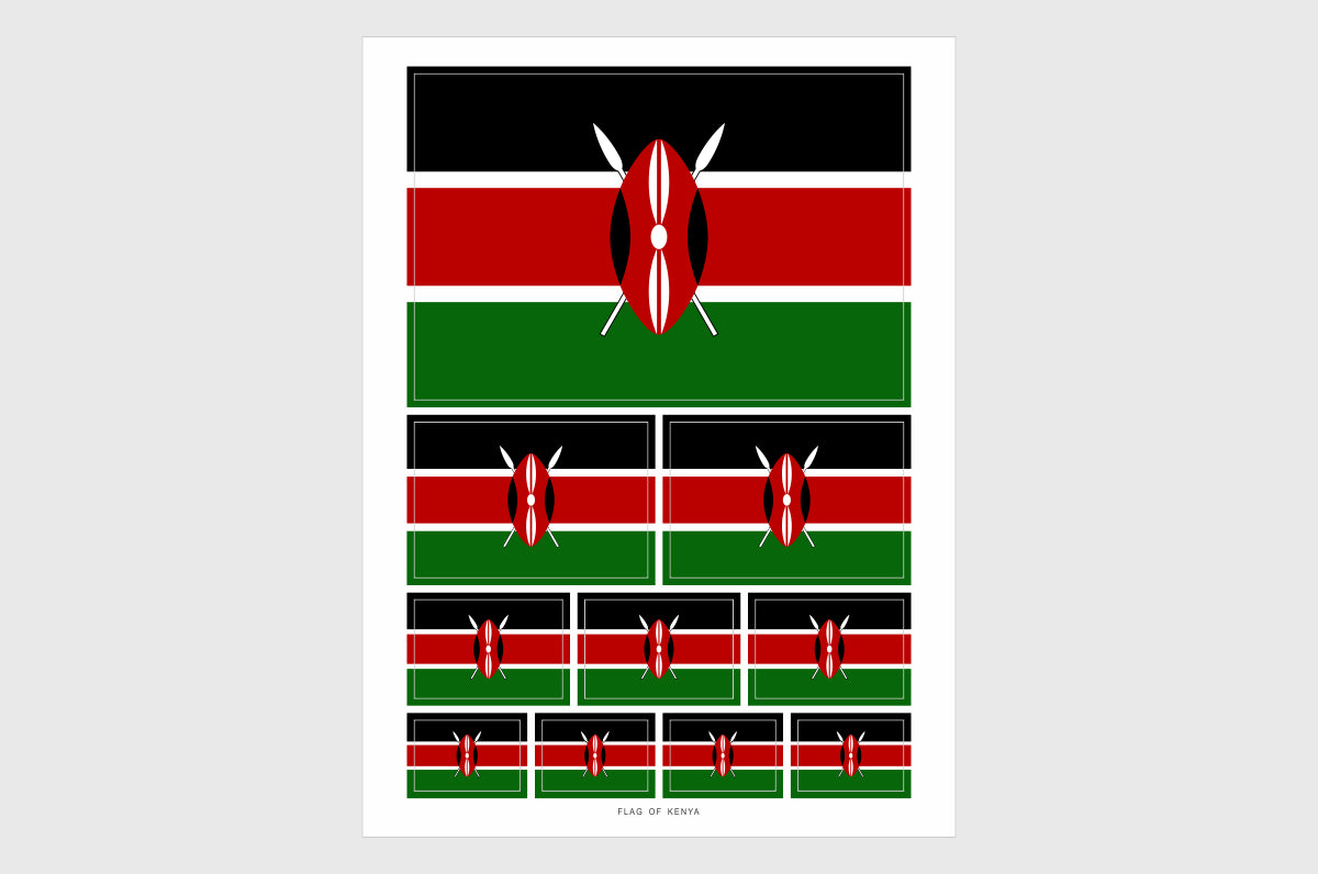 Kenya's flag is is a tricolour of black, red, and green with two white edges with a red, white and black Maasai shield and two crossed spears. The flag is based on the banner of the Kenya African National Union and was officially adopted on 12 December 1963 after Kenya's independence.