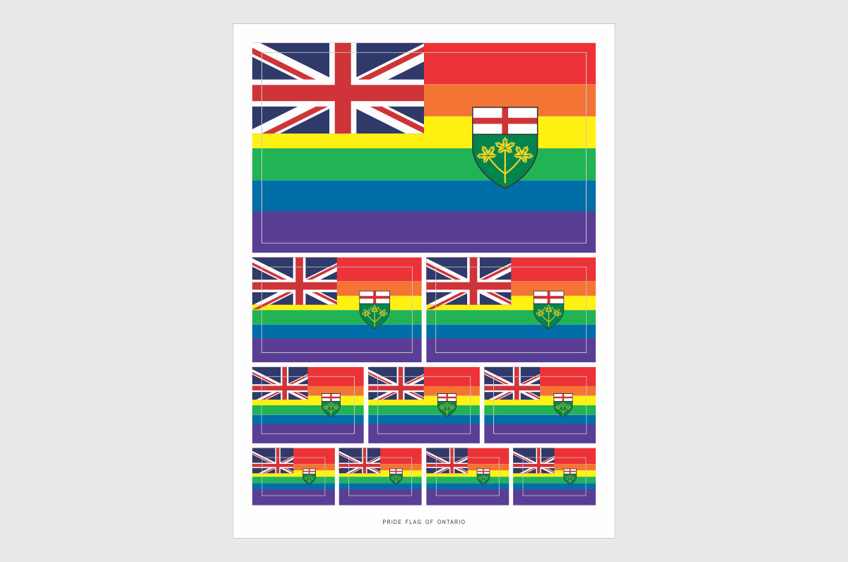 Ontario LGBTQ Pride flags incorporate the pride flag rainbow stripes recognized as the universal symbol of the LGBTQ community within the Ontario provincial flag.