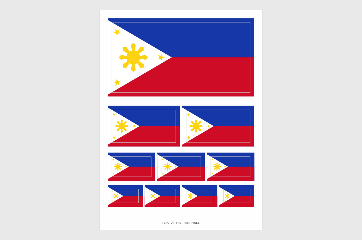 The flag of the Philippines is a horizontal flag with equal bands of royal blue and crimson red, with a white triangle at the hoist. In the center is a golden sun with eight primary rays representing each province.