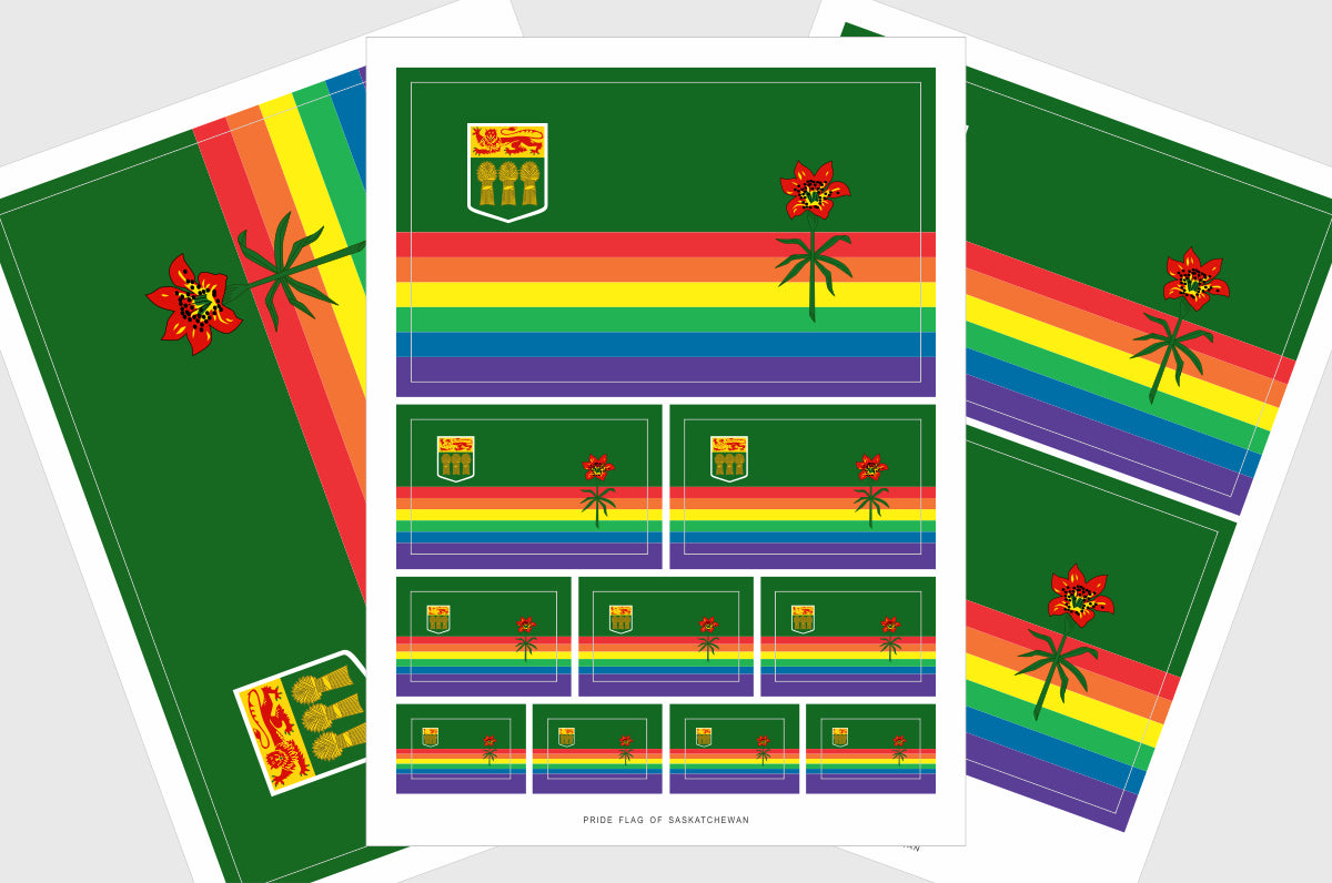 Province of Saskatchewan LGBTQ Pride flag stickers incorporate the Pride Rainbow stripes within the provincial flag and are a perfect for way to show you pride wherever you go.